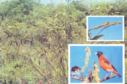 En la familia de los Fringílidos, el Cardenalito es quizás uno de los pájaros que mejor se ha adaptado a comer la gran variedad de alimentos que encuentra en su medio natural. Estos van desde las semillas que constituyen su principal fuente de nutrición, hasta los frutos, las hojas, los pétalos, el néctar de ciertas flores, y pequeños insectos, estos últimos, especialmente, en la época de la reproducción. Se ha observado que su dieta varía ampliamente según la época del año, es decir, que desde Enero a Diciembre van apareciendo y desapareciendo en el campo, distintos alimentos que él sabe como aprovechar a plenitud. Por otra parte, este pájaro es capaz de encontrar, a su debido tiempo, todas aquellas plantas que le suministran alimento, las cuales encuentra desde el nivel del mar, hasta los 1.500 m. de altitud, aproximadamente, a la vez que se desplaza con este mismo fin, por las zonas áridas, semiáridas y subhúmedas. Aunque es muy poco lo que realmente se sabe sobre las migraciones regionales que realiza este pájaro, se ha observado y comprobado que sus movilizaciones y dispersiones están más estrechamente relacionadas con aquellos tipos de vegetación que poco a poco le van suministrando alimento durante todo el año, que con el clima y el relieve que pudiese encontrar en sus distintas áreas de distribución, los cuales probablemente sean secundarios. En este trabajo se describirán, los principales alimentos que el Cardenalito suele encontrar en la Región Centroccidental, en donde el autor ha centrado el estudio de su ecología y de su comportamiento, desde 1960 hasta el presente. En las zonas semiáridas y subhúmedas de las serranías en donde se encuentra este pájaro abunda una planta de la familia de las compuestas llamada Clavelito (Wedelia calycina) por la cual tiene especial preferencia. Es tal la atracción y la dependencia por esta planta, que es posible considerarla como un indicador de convivencia, es decir, que dondequiera que esté el Clavelito es muy probable que se halle el Cardenalito, pues a través de los años se ha comprobado que en aquellos lugares en donde existe esta planta, también ha existido o existe esta ave. Muchos pajareros experimentados e incansables en su búsqueda y captura, han tomado como orientación y punto de referencia todos aquellos sitios donde crezca y se desarrolle esta planta. En el 98% de los sitios clásicos donde se han capturado Cardenalitos durante muchas décadas, siempre ha estado presente esta compuesta. El Clavelito tiene un tamaño entre 1 y 2 m., el cual puede variar según el lugar y la época del año. Es una planta cuyo follaje le sirve también de alimento al ganado vacuno y caprino y por esta razón es apreciado por los ganaderos. Esta planta florece durante los períodos lluviosos, bien sea en la época de lluvia propiamente dicha (Abril a Diciembre) o fuera de ella, siempre y cuando se den 1 ó 2 meses con suficientes precipitaciones. Ha sido localizada por el autor a diferentes alturas, las que generalmente oscilan entre los 40 y 1.500 m.s.n.m. Existen otras especies semejantes como: Wedelia fruticosa, W. parviflora y Calea berteriana, las cuales son muy parecidas al Clavelito, pero con pequeñas diferencias en cuanto al tamaño y la morfología de las hojas, flores y frutos. En los sitios más húmedos pueden vivir W. ambigens la cual tiene flores y frutos durante casi todo el año. En estos lugares las precipitaciones son más frecuentes. Por esta razón el Cardenalito y otros pájaros de la misma familia buscan estas regiones cuando las zonas áridas y semiáridas están en plena sequía. La flor de estas plantas compuestas cuando madura, tiene la forma de una copa, en cuyo interior se encuentran unas semillas de color negro, parecidas tanto en la forma como en el color a la "semilla negra" (alimento importado conocido también con el nombre de "Niger"), la cual puede considerarse como su comida predilecta cuando está en cautiverio. Se ha observado que el Cardenalito cuando está comiendo sobre las plantas de Clavelito, por lo general lo hace agarrando primero el fruto con una de las patas, a semejanza de como lo hacen las aves que se agrupan en la familia de los loros (Psittacidae), y luego con el pico va sacando las semillas que contiene. Este comportamiento observado en el campo, persiste aun cuando hayan pasado años en cautividad. En estas condiciones el pájaro mantiene y repite esta conducta para consumir dichos frutos. Después de unas lluvias fuertes en los Estados Lara y Falcón aparece el Anisito o Botonera (Lagascea mollis), planta herbácea y anual que crece, florece y fructifica en forma rápida y efímera, convirtiéndose por un tiempo en el principal alimento y en el más apetecible para el Cardenalito y sus pichones. Parece ser que le gusta y le nutre mucho por su alto contenido energético. Son semillas de plantas compuestas que contienen cierta cantidad de aceite. Es común que durante los meses señalados anteriormente, la primera y casi única pichonada ya está separándose de los padres y muchos de ellos andan por sí solos comiendo en los anísales. Esta semilla, igualmente tiene propiedades y características parecidas a la "semilla negra", la cual llega en muchos casos a convertirse en el casi único alimento que este pájaro come. Por esta razón, la mayoría de los pajareros la usa como la primera semilla que les dan de comer cuando son recién capturados. La ingieren con tanta facilidad que el autor los ha observado comiénv1 ola con apenas 1 ó 2 horas de haber sido atrapados. Por tener un alto contenido de grasas, se descompone con mucha facilidad, y en consecuencia se precisa conocer el estado en que se encuentra antes de dársela a él y a los otros pájaros. Cuando esta semilla se pone rancia, le causa serios trastornos digestivos, los cuales si no se tratan a tiempo y con productos específicos, le producen la muerte en pocos días. Muchas personas y principa
