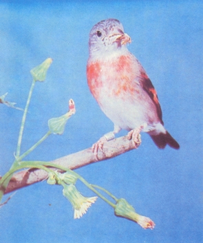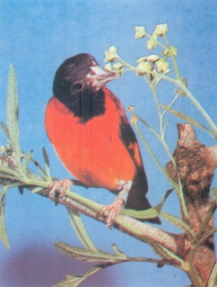 La forma como se comportan estos animalitos cuando están comiendo sobre la Pringamosa, es realmente curiosa. La mayoría de las veces para tomar uno de los frutos, lo realizan en forma muy parecida a como lo hacen los chupaflores (Trochilidae), es decir, se suspenden y se mantienen en el aire, agitando muchas veces las alas hasta cuando logran tomar uno de los frutos, para luego ir a comérselo a una de las ramas. Es posible que este comportamiento se deba a que los pedúnculos de la Pringamosa son de naturaleza urticante, evitando de esta manera el contacto directo con aquéllos. En otras oportunidades se ha observado que cuando el racimo está cerca de una rama, se posan en ella y comen directamente los frutos, sin tener que volar con tanto esfuerzo como lo hacen los chupaflores. De Mayo a Junio después de las primeras lluvias, fructifica en Falcón y Lara un arbusto de unos 5 m. de altura, denominado Guatacaro, del cual se conocen dos especies comunes en la zona árida y semiárida respectivamente, el (Capparis hastata) y el (C. flexuosa). En el primero el fruto es alargado, rugoso y cilindrico, con unos 12 a 18 cm. de largo, por 1 a 2 cm. de ancho. En cambio en el segundo, el fruto aunque tiene la misma longitud que el primero, es de menor grosor, de 0.5 a 1 cm. de ancho, liso y contraído entre las semillas. El fruto se abre y deja al descubierto unas semillas grandes, vistosas y llamativas, rodeadas de un arilo carnoso y de color blanco, el cual se convierte en el alimento casi único para el Cardenalito durante esta época. Además de la cubierta de la semilla come también el tegumento del fruto, el cual tiene un color rojo púrpura encendido y es probable que contenga carotenos. Esto contribuiría a intensificar el color de los pichones y de los adultos cuando están en período de muda. Muchos pajareros, acostumbran poner encima de la jaula de los "pitadores" frutos de Guatacaro maduros y abiertos con la finalidad de atraer a los que viven en forma silvestre, quienes ante la presencia de dichos frutos, se lanzan en su búsqueda y son capturados más fácilmente. En la Serranía del Macizo de Nirgua en el Estado Yaracuy, entre los 700 y 1.000 m.s.n.m, crece en abundancia una planta herbácea llamada Amarillito (Sclerocarpus coffaecoíus), la cual durante los meses de Junio a Agosto, era en esta zona uno de los más abundantes para el Cardenalito. Esta planta tiene un gran parecido con el Clavelito, tanto en su morfología como en el fruto y al igual que aquél, le gusta mucho a los Chinities (Carduelis psaltria) y Corbatines (Carduelis xanthogastra) de esa región. En las zonas semiáridas de Falcón, Lara, Portuguesa y Yaracuy, crece un arbusto también de la familia de las compuestas que comúnmente se le conoce con el nombre de Tara Amarilla (Oyedaea verbesinoides). Al Cardenalito y al Chirulí se les ha observado comiendo las semillas de esta planta, las cuales son parecidas a las del Clavelito (W. calycina), pero de un tamaño mayor, tanto las flores como la planta. Al parecer es una planta invasora. Con frecuencia se le observa a los lados de las carreteras Barquisimeto-Yaracuy, Chivacoa-Nirgua-Valencia, Barquisimeto-Acarigua, Barquisimeto-Aroa, Marín, así como en casi todas las vías que penetran en el Parque Nacional de Guatopo y en las muchas sabanas de las lomas. Se ha observado que durante la época de lluvias, unas 3 semanas después del período de mayor precipitación, entre Septiembre y Noviembre casi todos los "conucos" situados en la Serranía de San Luis, Churuguara y Bobare, son invadidos por un conjunto de otras compuestas herbáceas como: el Clavel de Muerto (Bidens pilosa), el Papelillo (Elephantopus mollis), el Colmillo de Puerco (Synedrella nodiflora), y el Diente de León (Taraxacum officinale), las cuales producen abundantes semillas que atraen a los Cardenalitos y a otros pájaros de la familia de los Semilleros (Fringillidae). Por esta razón, los "conucos" representan para este pájaro fuentes potenciales de alimento. La tendencia actual de eliminar muchos de ellos, debido al desarrollo de la ganadería, quizás sea otro factor más que esté contribuyendo en parte a su desaparición. Al inicio de las lluvias, de Marzo a Mayo, en las Serranías de los Estados Falcón y Lara, aparecen las flores del Bejuco Blanco (Chamissoa altissima), el cual crece enredándose en los árboles y arbustos que están a su alrededor, llegando a alcanzar una altura de hasta unos 5 m. aproximadamente. Cuando los Cardenalitos están comiendo sobre las grandes inflorescencias blanquecinas que producen estas plantas, surge un bello contraste, entre el rojo del pájaro y el blanco de las flores, que llama poderosamente la atención. Esta planta también le brinda alimento a otros pájaros de la familia de los Fringílidos y de los Traúpidos. El Gamelote (Panicum maximum) es una gramínea africana que se siembra en los terrenos donde se han talado zonas boscosas; espiga y madura durante las distintas épocas del año. Sin embargo, y a pesar de su abundancia, al Cardenalito se le ve con muy poca frecuencia comiendo estas semillas y sólo lo hacen cuando hay escasez de alimentos en el medio. Dicha semilla y su fruto se parecen mucho al alpiste, tanto en la forma como en el color. Aunque él aprende a comer alpiste en cautiverio y éste con el tiempo se convierte en su principal alimento, a este pájaro le cuesta tiempo para llegar a comérselo regularmente. El autor tiene conocimiento de algunos casos referidos por pajareros, en los cuales ha muerto de hambre, antes de haber empezado a comer el alpiste. Las semillas de Gamelote casi nunca se le dan como alimento en cautiverio. El Bledo (Amaranthus dubius) es una planta herbácea que crece y fructifica después de las lluvias principalmente en terrenos cultivables. Su semilla la come el Cardenalito, los Chirulíes y muchos otros pájaros, de la familia de los Fringílidos. Sin embargo, lo hacen con muy poca frecuencia y gene